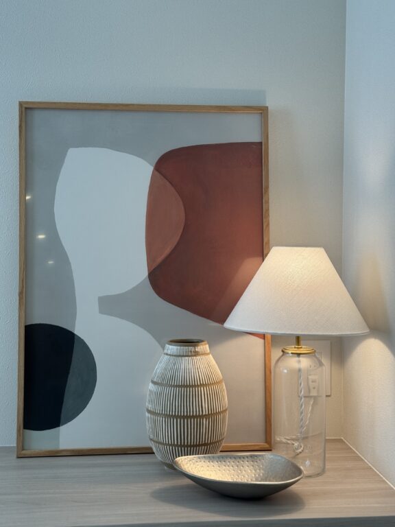 温かみのあるテラコッタ色でアートと色を合わせて繋がりを作りました。